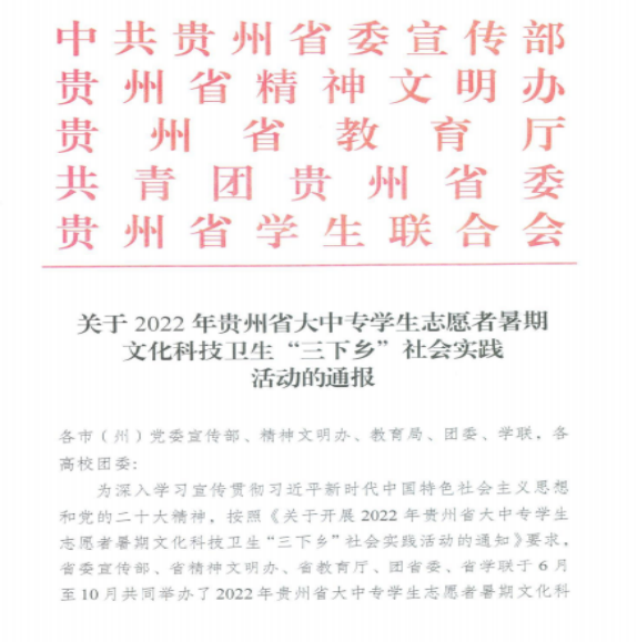 近日,中共贵州省委宣传部等部门联合印发《关于2022年贵州省大中专学生志愿者暑期文化科技卫生“三下乡”社会实践活动的通报》,我校青年积极投身实践,表现突出,获2022年贵州省大中专学生志愿者暑期文化科技卫生“三下乡”社会实践活动优秀单位2个、优秀实践团队9个、优秀个人6名。具体获奖名单如下: