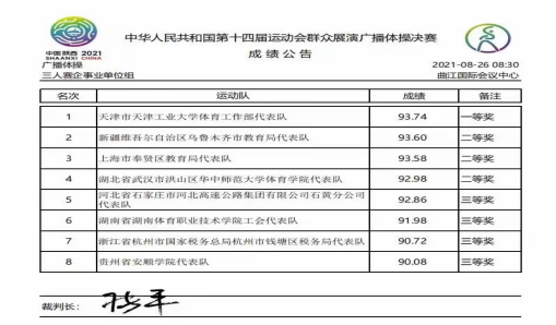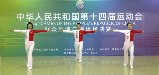 据悉,中华人民共和国第十四届全运会群众展演比赛分为两阶段进行,第一阶段在全国各省进行预赛,分别选拔出第一名代表本省参加全国总决赛,第二阶段全国总决赛于2021年8月20日至27日在陕西西安曲江国际会议中心隆重举办,堪称历史上首届高效、精准的全运会广播体操评比。