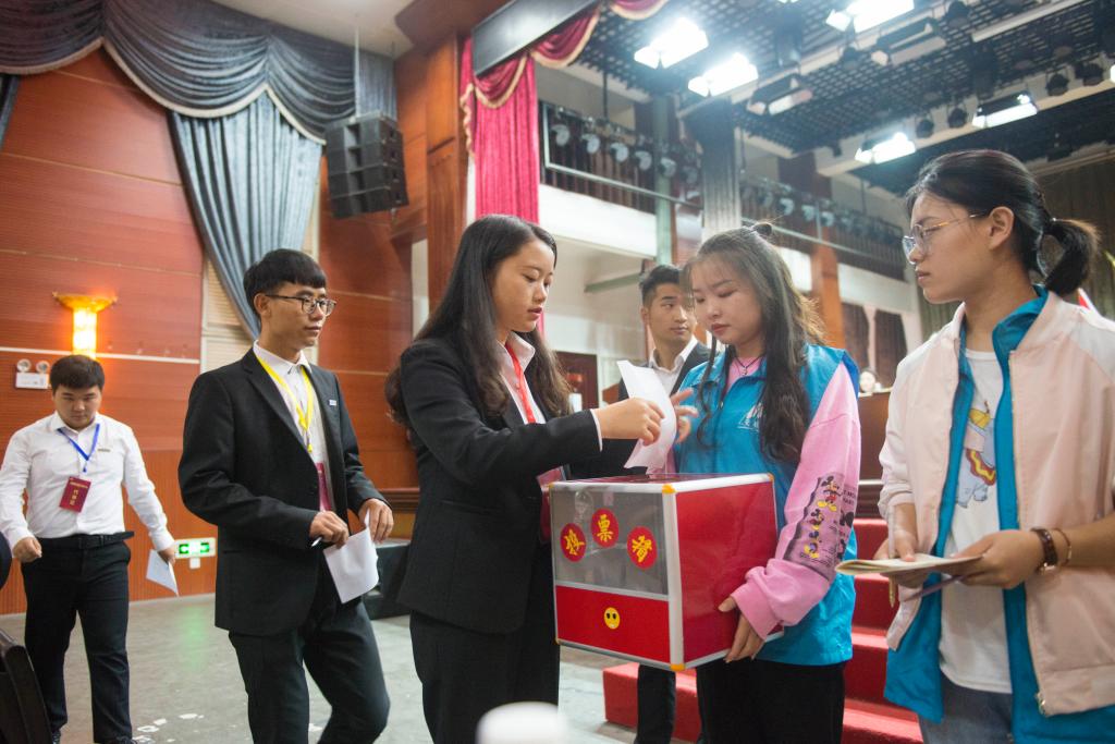 随后,安顺学院第四届学生代表大会举行换届选举, 校团委办公室主任张丽宣读了安顺学光第四届学生代表大会选举办法,经全体与会代表讨论并通过安顺学院第四届学生代表大会选举办法。校团委组织部部长谌兰樱宣读了监票人、计票人名单并介绍第四届学生代表大会主席团候选人基本情况。经过激烈的竞选环节,六位同学当选安顺学院大学生联合会主席团成员。