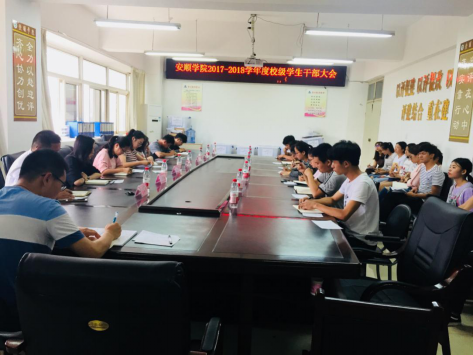 2018年7月6日下午4:00,安顺学院2017-2018学年度校级学生干部大会在教务处四楼会议室召开。校团委副书记胡蕾,组织部部长谌兰樱,办公室主任张丽,校团委老师吴胜艳、周瑞祥、王振伟、邓韧,校团委指导的各校级学生组织代表参加会议。会议由校团委周瑞祥老师主持。