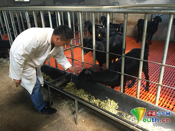 安文忠在集中养羊场查看努比亚山羊进食状况。本人供图
